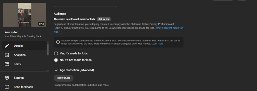 This is the fastest way to kill your YouTube channel’s growth if you get it wrong. In your upload settings, you will see a question: “Is this video made for kids?”