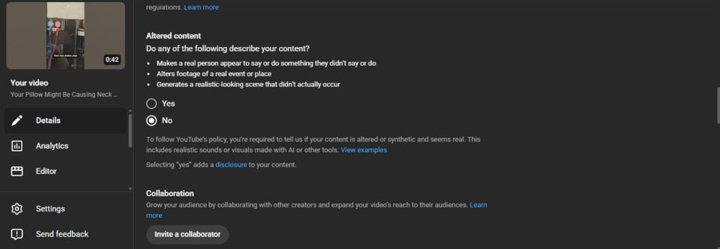 If you click Yes when you don’t need to, you are telling YouTube your video is synthetic or fake, which can hurt your reach. Only click Yes if you are using AI to fake real people or events.